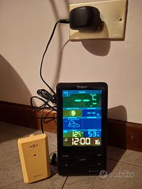 Stazione meteo con temperatura e umidità interna ed esterna, previsioni meteo, messaggi allerta meteo, allarme rischio gelate. Con sensore da apporre all'esterno. Funzionante, come nuova ma con sensore esterno un po' ingiallito come si può notare dalla foto.