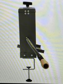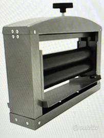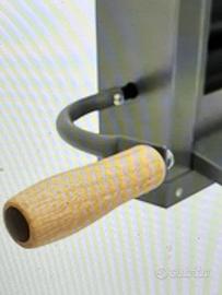 Strizzatore manuale in acciaio al carbonio e rulli in NBR resistenti a olio e sostanze chimiche. Dimensioni in cm H 44 L 45 ( 68 con manovella ) P 15,5 . Colore grigio , fornito con staffe di fissaggio e farfalla di regolazione della pressione dei rulli (0,1-20 mm) larghezza cilindri cm 38 impugnatura manovella ergonomica in legno. Elimina il 95% di acqua