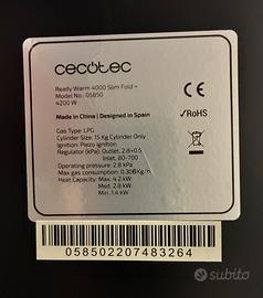Marca: Cecotec Modello: Ready Warm 4000 Slim Fold + Potenza massima: 4,2 kW Alimentazione: GPL (bombola fino a 15 kg) Accensione: Piezoelettrica Consumo massimo: 0,306 kg/h Regolazione potenza: 3 livelli (1,4 / 2,8 / 4,2 kW) Pressione di esercizio: 2,8 kPa È una stufa catalitica/infrarossi con pannello ceramico radiante, dotata di vano interno per bombola e ruote.