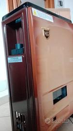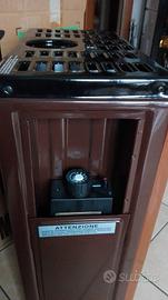 stufa a gas mod 5500T M G RECORD nuova, mai usata,ancora imballata - causa cambio trasloco - Gruppo valvola termostatica (T) multifunzionale *5500T che raggnippa i comandi ed i dispositivi di regolazione e di sicurezza.. Dispone di pulsante per l'accensione piezoelettrica; manopola raggruppante tutti i comandi con riferimenti relativi alle varie posizioni per le operazioni di accensione fiamma pilota (*) spento e di regolazione della potenzialità mediante termostato. La sicurezza è termoelettrica Mobile in acciaio verniciato con polveri. Fianco sinistro asportabile pereventuale manutenzione. Doppio scambiatore di calore in acciaio con cappa antivento incorporata. Oblò panoramico per la visione della fiamm, a due strati, interno in vetro "Pirex" esterno vetro temperato, per aumentare la distribuzione del calore per irraggiamento. Bruciatore "Multigas", totalmente in acciaio INOX. Gruppo pilota regolabile per qualsiasi tipo di gas. Diametro del tubo di scarico: 8 cm, con scarico fumi verticale Le dimensioni di queste stufe MG sono veramente rivoluzionarie. Dati tecnici Dimensioni (LxPxA); cm 40,5x27x65 Portata termica: kW 5,50 Consumo gas: Met.mc/h 0,64 / Gpl g/h 320 Capacità di riscaldamento ambiente La limitatissima profondità permette la sistemazione delle stufe MG anche in piccoli locali nel punto più adatto, senza problemi di spazio n.8 tubi diam 8 cm 100 cad.5.50 smalt bianco - ancora imballati n.5 curve diam 8 cad.4.00 n.2 fascette allacciatubi cad.1.00 vendibili anche separatamente dalla stufa .. ingombro ridottissimo può funzionare con la bombola cambiando gli ugelli