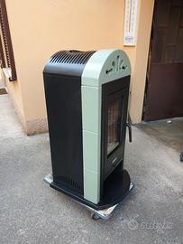 Vendo stufa a legna Caminetti Montegrappa, modello Primavera, con rivestimento in pregiata maiolica (ceramica) color verde acqua e struttura interna in ghisa.