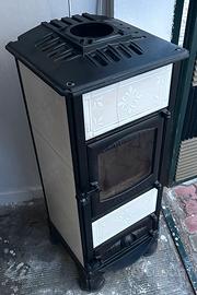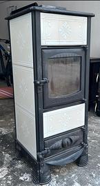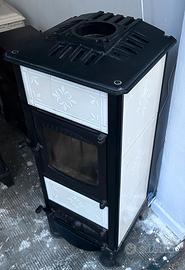 Vendo stufa a legna marca CASTELMONTE modello “Futura 03” potenza 8 Kw, usata pochissimo, pronta all’uso, struttura in ghisa, focolare in acciaio inox rivestimento in ceramica. Scalda sia per convezione che per irraggiamento, e grazie alla camera di combustione in inox produce molto calore e velocemente. Dimensioni: P 44, L 42, H 124 cm. Volume riscaldabile: 270 mc. Diametro uscita fumi: 120 mm. Peso: 90 kg Viene venduta completa di tubi e curve. Purtroppo nello spostarla si è filata la piastrella sopra alla porta. Posso trasportarla nel raggio di 100 km da Torino o spedirla nel resto di Italia.