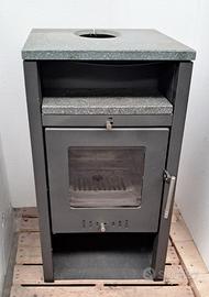 Stufa a legna compatta (larghezza 50, profondità 38cm, altezza 90cm) per ceppi di legna da 25cm. Design tedesco essenziale da produttore HAAS-Sohn modello Ecoline 281. Scocca in acciaio antracite e doppio piano in pietra ollare con spessore di 3cm che funge da volano termico e aggiunge fascino alla stufa. Robusta griglia in ghisa e camera di combustione con refrattari integri. Ampia base portalegna. Uscita fumi superiore di diametro 15/13cm L'ho usata solo 2 stagioni quando il pellet era introvabile e ho dovuto ripiegare sul riscaldamento a legna.