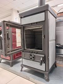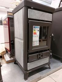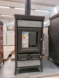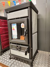 costruita in acciaio e ghisa con grande superficie di scambio. Area riscaldabile 100 metri quadrati, potenza nominale 11,1 Kw con finitura in maiolica rossa.