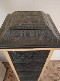 Stufa in maiolica anni '80 con un design elegante e decorativo. Rivestimento in ceramica decorata. Dettagli in metallo.
