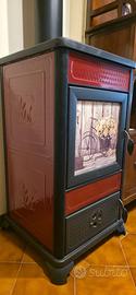 Elegante stufa a legna con struttura in ghisa e pannelli in porcellana bordeaux.