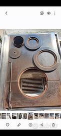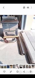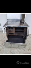 stufa a legna in acciaio molto ben tenuta con ampio forno per cottura e cassone per stoccaggio legna sono compresi anche i tubi in acciaio