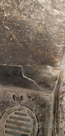 Stufa a legna, vernice in buone condizioni ma alcuni segni su porta antina inserimento legna, pietre interne con crepe ma intere, piano in ghisa con crepa zona tubo di scarico