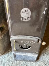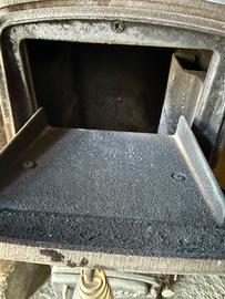 Vendo stufa a legna in ghisa o acciaio resistente per il riscaldamento domestico. Presenta un design classico con maniglia a molla e uno sportello inferiore per la gestione della cenere. Ideale per arredamenti rustici o taverne come pezzo di antiquariato funzionale