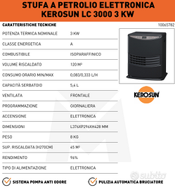 Vendo stufa a petrolio elettronica Kerosun LC 3000, acquistata a ottobre 2025 e utilizzata pochissimo. Il prodotto è praticamente nuovo, in perfette condizioni estetiche e funzionali, ancora coperto da garanzia ufficiale (fornisco ricevuta d'acquisto).