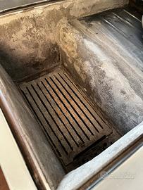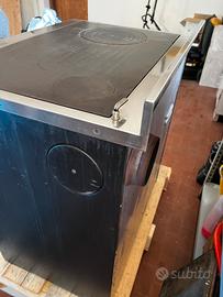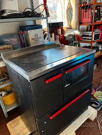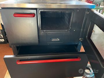 Vendo stufa economica a legna, 80x60, nera opaca con maniglie rosse, forno e cassetto porta legna, piastra in ghisa in ottime condizioni, bocca di fuoco in materiale refrattario appena rifatta (vedi foto) uscita fumi a destra dietro e dal fianco.