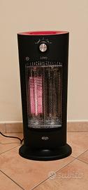 Stufa elettrica al quarzo ARGOCLIMA, nera e rossa. Potenza massima 800W, funzione ECO 400W. Resistenze in fibra di carbonio. Oscillazione: 70°. Adatta per stanze fino a 35 m³. Larghezza 30 cm, Profondità 24 cm, Altezza 64 cm.