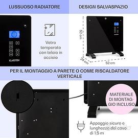 Come nuova, usata una settimana per supplire a guasto al condizionatore. Stufetta per Casa, Termosifone Portatile, Termoconvettore a Parete. Stufa elettrica Klarstein modello Norderney a basso consumo energetico da 1000 W. Con piedini e opzione di montaggio a parete. Dispone di protezione da surriscaldamento che ti consente di lasciare la stanza in sicurezza quando il pannello riscaldante è acceso. Tramite display LCD, con il termostato regolabile integrato e il timer di spegnimento automatico, puoi impostare la temperatura ideale senza sprechi. È silenziosissima, inizia a scaldare dopo pochi secondi dell'accensione. Bella da vedere, buoni i materiali di assemblaggio. Cavo di 1,5m Potenza: 1000W Prezzo Amazon: 100€