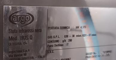 Stufa ad infrarossi a gas GPL Argo, prodotto italiano, con alloggiamento bombola, pari a nuovo perfettamente funzionante. Si vende con tubo per bombola nuovo, esclusa bombola di gas