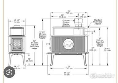 Uscita fumi opzionale: Superiore, Posteriore e Lati diametro 120 adattabile con riduzione al diametro della canna fumaria esistente.