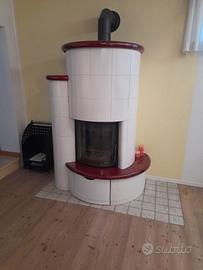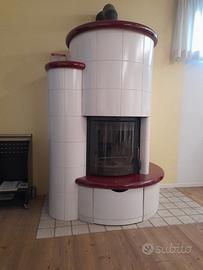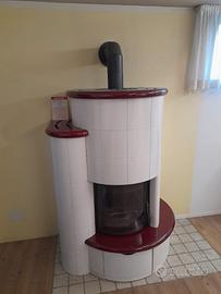 Stufa composta da una struttura realizzata con refrattari pregiati per il massimo accumulo di calore, beige/bordeaux.