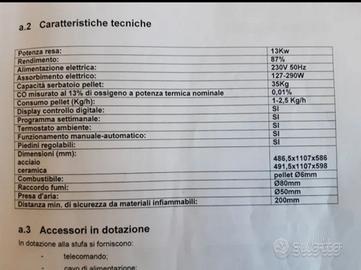Vendo stufa pellet modello vienna karmek one ,euro 800 compreso di tutti i tubi ,i tubi sono più o meno 6 metri ,i tubi sono da smontare,sono in buono stato, do anche telecomando,unico problema la cornice attorno allo scivolo pellet un po storta dall calore che non comporta problemi,poiché il pellet scende lo stesso,descrizione tecnica vedi foto,la stufa è alta 111 cm dal pavimento,larga 58 cm,lunga 47 cm.Stufa a pellet Vienna Vienna acciaio è un modello di stufe Karmek a pellet dalle alte prestazioni. Nonostante le dimensioni contenute questo prodotto riscalda fino a 350 m3 di volume con una potenza termica di 13 kW ed un rendimento calorico garantito dell'88%. L'efficienza termica è ottimizzata dall'ampio braciere che favorisce la combustione del pellet. Il serbatoio ospita una quantità di pellet pari a 35 Kg, ogni ora il consumo di combustibile varia da un minimo di 0, 8 a un massimo 2, 6 Kg in base ai livelli di lavoro impostati: meno consumi e meno ricariche a favore di una lunga autonomia e di un'elevata funzionalità. La stufa a pellet Vienna è dotata di pannello digitale per il controllo delle impostazioni e di sistema per la programmazione oraria settimanale delle fasi di accensione e spegnimento, nonché del livello di temperatura. Può essere azionata manualmente o automaticamente, dispone di un ventilatore per lo scambio d'aria e di un cassetto per raccogliere la cenere ed eventuali residui che contribuisce a facilitare le operazioni di manutenzione del prodotto.