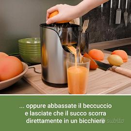 🥃 FUORIUSCITA DEL SUCCO NEL BICCHIERE : il succo appena spremuto finisce direttamente nel bicchiere sottostante attraverso il beccuccio ribaltabile. Quando il beccuccio è ribaltato, il succo spremuto può rimanere anche nel grande recipiente da 235 ml dello spremiagrumi.