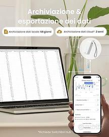 Supporta l'esportazione dei dati: Fino a 68 giorni di archiviazione dei dati a bordo e archiviazione cloud illimitata. Grazie ai nostri grafici a colori aggiornati, è possibile visualizzare chiaramente la temperatura e l'umidità su base annuale, mensile, giornaliera o oraria. I dati possono essere esportati come file .csv per un'analisi più approfondita dell'ambiente. Supporta diversi metodi di calibrazione dei dati.