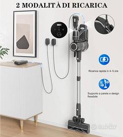 Questo aspirapolvere senza fili offre fino a 60 minuti di pulizia senza fili. É dotato di una stazione di ricarica a parete salvaspazio che carica il tuo aspirapolvere, carica completa in 4-5 ore. Display Touch LED moderno, questo scope elettriche senza filo è dotato di tre modalità di potenza regolabili