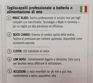 Tagliacapelli Moser misure taglio 3 / 6 / 9 / 12mm Purtroppo funziona solo con alimentazione collegata. Ideale per uso domestico. Ottimo affare usata pochissimo.