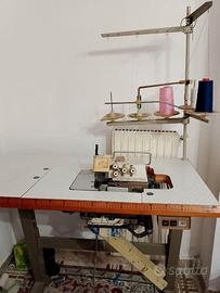 Macchina da cucire tagliacuci a 5 fili, completa di banco di lavoro, motore e portafili.