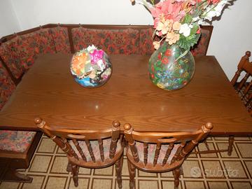 Tavolo 160 x 85 cm + giropanca con sedute apribili a contenitore (140 x 214 cm) + 3 sedie, tutto in legno massello
