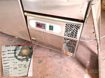 tavolo frigorifero ad incasso usato, si tratta di tavolo refrigerato con motore a bordo funzionante a 220v 3 ante e cassetto privo di piano lavoro (probabilmente usato sotto la parte estetica di un banco bar). di marca Baron Cucine modello TR47 del 2000.