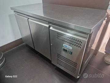 Tavolo refrigerato professionale per teglie GN 1/1 di ultima generazione basso consumo energetico e compatto ambientale con struttura realizzata in acciaio inox. Tropicalizzato, lavora fino a temperature di 40°C ambiente e 60% di umidità. E' dotato di refrigerazione ventilata e ricircolo di aria fredda con evaporatore trattato anticorrosione. Gruppo incorporato, termostato digitale che permette un facile controllo di temperatura e sbrinamento automatico con resistenza elettrica. Lo spessore di isolamento è di 6 cm, con chiusura ammortizzata delle ante, vano tecnico apribile ispezionabile con chiusura a chiave. In dotazione 4 ripiani interni in acciaio rivestito rilsan, n°2 con paio di guide regolabili, piedini regolabili in acciaio inox da 11 a 17 cm.