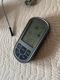 Termometro per la cottura degli alimenti, ha una base con trasmettitore e sonda con sensore (da inserire all'interno degli alimenti) e un'unità di controllo con ricevitore e display digitale. Ha il timer da cucina, vari programmi e livelli di cottura. La Base e l'unità di controllo sono alimentate da batterie usa e getta, di colore nero e grigio. In dotazione: clip da cintura, chiusure in velcro, coperchio per sonda, manuale di istruzioni utente in Italiano e altre lingue, scatola e imballi.
