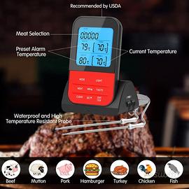 Alta Precisione e Ampio Intervallo Di Temperatura: -20~250°C/-4~482°F, con una deviazione di ±1°C. 2 sensori di temperatura con cavo da 100 cm possono essere utilizzati per due tipi di carne contemporaneamente.