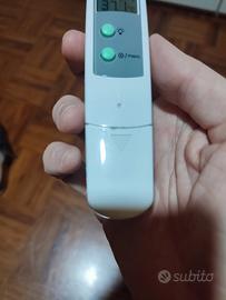 Termometro auricolare comprensivo di 11 cappucci. Con astuccio. Come si può vedere dalle foto, la plastica intorno al vano batterie è leggermente rovinata. Funziona con 2 batterie CR2032 non incluse.