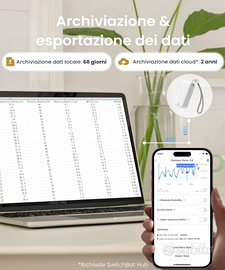 Supporta l'esportazione dei dati: Fino a 68 giorni di archiviazione dei dati a bordo e archiviazione cloud illimitata. Grazie ai nostri grafici a colori aggiornati, è possibile visualizzare chiaramente la temperatura e l'umidità su base annuale, mensile, giornaliera o oraria. I dati possono essere esportati come file .csv per un'analisi più approfondita dell'ambiente. Supporta diversi metodi di calibrazione dei dati.