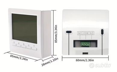 il termostato per caldaia o boiler ha uno schermo LCD digitale. Viene utilizzato per controllare le caldaie per avviare o interrompere il funzionamento al fine di regolare la temperatura ambiente. Il termostato rileva la temperatura ambiente e, quando la temperatura reale è inferiore alla temperatura impostata, controlla la caldaia per avviare il funzionamento. Successivamente, il termostato controlla la caldaia per interrompere il funzionamento quando la temperatura reale è superiore alla temperatura impostata. Specifiche del prodotto Tensione di lavoro: 2x batterie AA da 1,5V (Le batterie non incluse) Consumo di energia: < 150uW Intervallo di controllo della temperatura: 5~99°C / 5-95°C (impostazione di fabbrica 5~35°C) Intervallo di limitazione della temperatura: 5~99°C / 5-60°C Precisione del controllo della temperatura: ±1°C Dimensioni: 85x85x28mm Sensore: Incorporato Colore: bianco Retroilluminazione: si