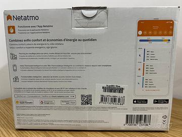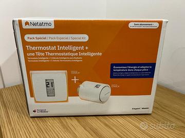 Kit composto da Termostato connesso compatibile con caldaie individuali (elettrica, gas, gasolio, legno), pompe di calore e pompe di calore aria-acqua e stufe a legna/pellet più Testa termostatica connessa con adattatori per radiatori ad acqua calda. Nuovo imballato mai usato