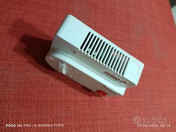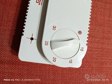Questo dispositivo è un termostato meccanico da parete del marchio Vemer, modello Clima. Funzione: Regola la temperatura dell'ambiente controllando l'accensione e lo spegnimento dell'impianto di riscaldamento o raffreddamento. Regolazione: È dotato di una manopola frontale per impostare la temperatura desiderata e di un interruttore rosso per l'accensione/spegnimento manuale. Tecnologia: Meccanica, utilizza un sensore interno per rilevare la temperatura attuale e attivare i contatti elettrici di conseguenza.