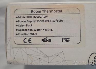 Termostato ambiente WiFi modello BHT‑8000GALW, colore nero, per impianti di riscaldamento ad acqua (pavimento o radiatori). Alimentazione 95‑240 V AC, uscita relè 5 A, attacco a incasso con morsetti L/N e contatto pulito, ingresso sonda NTC esterna e porta Modbus per integrazione domotica. Display touch a sfioramento con programmazione giornaliera/settimanale, controllo da app tramite rete WiFi, compatibile con principali assistenti vocali (tipo Alexa/Google).