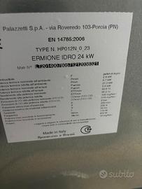 Termostufa a pellet: prodotta da Palazzetti modello Ermione Idro 24 KW: Termostufa a pellet per la produzione di aria calda, canalizzazione esterna, gruppo idraulico integrato, vetro ceramico, telecomando incluso, funzionamento programmabile.