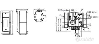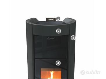 Pannello digitale LCD, crono settimanale con 3 programmazioni giornaliere indipendenti e di facile utilizzo, pressostato meccanico di sicurezza, porta in ghisa, ampio vetro ceramico serigrafato, cassetto cenere e maniglia amovibile, porta maniglia, valvola di limitazione della pressione.