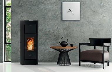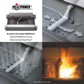 Termostufa a pellet, dotata di bruciatore motorizzato con tecnologia brevettata PELLETPOWER®: permette di mantenere la resa termica elevata e costante e ridurne i costi di esercizio (consumo e manutenzione).