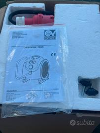 Termoventilatore professionale vortice Caldopro Plus 5000T-5000W.Termoventilatore elettrico portatile ad alte prestazioni,ideale per ambienti industriali,cantieri,magazzini e laboratori,dotato di una potenza massima di 5000 W e alimentazione trifase a 400 V,è progettato per garantire un riscaldamento rapido ed efficiente in spazi di medie e grandi dimensioni.Il dispositivo è dotato di un selettore di potenza rotativo con quattro posizioni:spento,metà potenza,potenza intera,e sola ventilazione.Inoltre dispone di un timer meccanico con una durata massima di 180 minuti,che consente il spegnimento ritardato,per garantire la sicurezza durante l’uso,è presente un dispositivo di sicurezza a ripristino automatico,funzionante come protettore termico montato sulla resistenza.Il cavo ha una lunghezza 1,8m ed è completo di spina industriale a 5 poli.Le dimensioni 250X300x340mm.Il peso 5,4kg.Nuovo mai usato.