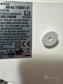 Scaldabagno Termoventilatore pari al nuovo, usato solo un mese per passaggio a termoventilatore a muro. Non ho la scatola, potenza 1000/2000W Funzione ventilazione aria fredda Piedino sottostante per protezione anti ribaltamento Solo consegna a mano
