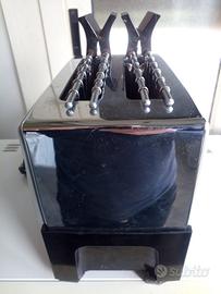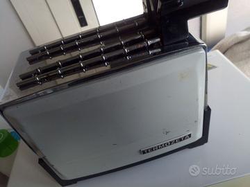 Tostapane italiano anni 70 prodotto da Termozeta modello Marida in metallo laccato di beige , metallo cromato e plastica dura nera . Il tostapane e' in ottime condizioni , con il cavo elettrico originale preferibile farlo controllare da un tecnico . Le sue misure sono : larghezza 24 cm ( 9.4 '' ) ; profondita' 11,5 cm ( 4.5 '' ) ; altezza 21,5 cm ( 8.5 '' ) . Il suo peso e' Kg 1,780 ( 3.9 lb ) .