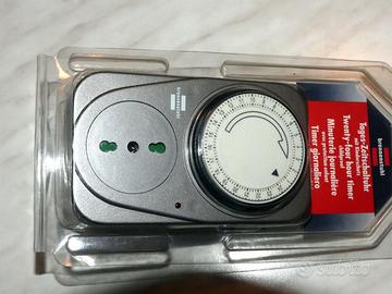 Timer programmabile meccanico giornaliero (24 ore). Possibilità di impostare 96 interventi, con intervallo minimo 15 minuti. Spina posteriore 16A, presa anteriore bipasso. Nuovo, mai utilizzato, ancora nella sua confezione.