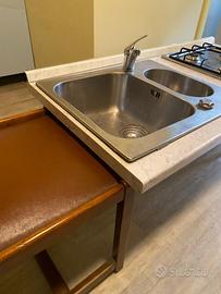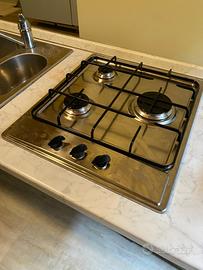 Top resistente con fornelli a 3 fuochi, lavandino con 2 vasche in acciaio inox. Dimensioni top totale: Larghezza 122cm Profondità 60cm Dimensioni lavandino: Larghezza 58 cm Profondità 50 cm Piano cottura: Larghezza 44 cm Profondità 50cm Buone condizioni 2 Manopole per accensione gas da sostituire.
