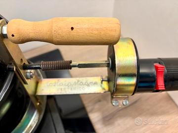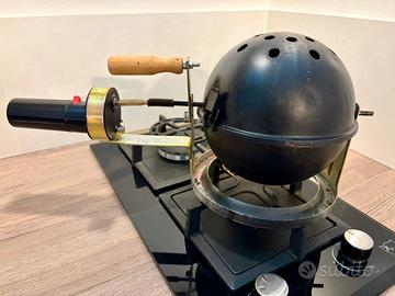 Apparecchio elettrico per tostare le castagne, USATO ma in buone condizioni . - Struttura sferica nera. - Manico in legno. - Base metallica. - Funziona con una pila torcia , tipo D - Rotante Per poter tostare le castagne va messo su un fornello a gas o su un braciere.