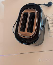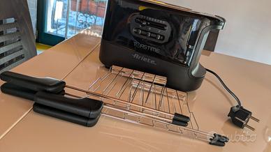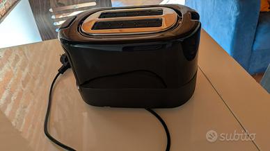 Tostapane elettrico con pinze in acciaio inox e 9 livelli di doratura. Tostapane con funzioni scongelamento e riscaldamento e scalda brioche integrato. 700watt , 2 slot per toast con pinze estraibili e vassoio raccogli briciole rimovibile. Dimensioni 16,5P x 27,5l x 18H cm Non ho né scatola né libretto di istruzioni ma si può comodamente scaricare da internet.