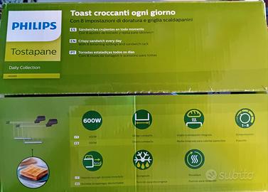 Vendo tostapane Philips serie Daily Collection (modello HD2583), colore nero, in condizioni impeccabili. L'apparecchio è stato usato per una 15ina di giorni (vendo solo perché nel frattempo sono riuscito a riparare il mio vecchio tostapane a cui sono affezionato). È praticamente nuovo, pulitissimo e perfettamente funzionante. Caratteristiche principali: Potenza: 600W (efficiente e veloce). 8 impostazioni di doratura: per toast perfetti secondo i tuoi gusti. Griglia scaldapanini integrata: comodissima per scaldare brioche, panini o focacce senza bruciarle. Funzioni Extra: Scongelamento e riscaldamento rapido. Pulizia facile: dotato di vassoio raccoglibriciole rimovibile. Incluso di scatola originale e manuale d'istruzioni (come da foto).