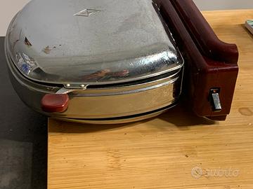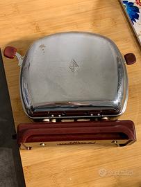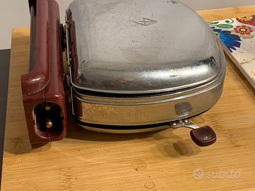 Splendido esemplare di tostapane d'epoca prodotto dallo storico marchio Prometheus, modello WRO. Un vero pezzo di storia del design industriale, perfetto per collezionisti o come complemento d'arredo in stile Mid-Century / Retro.L’oggetto presenta l’iconica base in bachelite color bordeaux/rosso scuro e corpo in metallo cromato. Sulla base sono riportati i dati tecnici originali (400W - 220V).DETTAGLI E CONDIZIONI:Marca: PrometheusModello: Type WROStato estetico: Ottime condizioni vintage, cromature ben conservate e bachelite integra (vedi foto).Note tecniche: L'oggetto viene venduto SENZA CAVO di alimentazione. Non essendo stato testato, è proposto come elemento decorativo, da esposizione o per recupero parti originali.Un'occasione imperdibile per amanti del modernariato e del "Made in Germany" d'altri tempi. #vintage #tostapane #prometheus #modernariato #retrodesign #vintagekitchen #bachelite #midcentury #antiquariato #designitaliano #collezionismo #vintagestyle #arredovintage