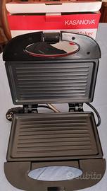 Tostiera elettrica Kasanova con apertura a libro e doppia piastra in alluminio, ideale per preparare panini, piadine e carne alla griglia. Rivestimento esterno cool touch e impugnatura resistente al calore. Dimensioni 22X21X8,5 cm; potenza 700-800 W. Articolo nuovo, mai usato, imballo originale.